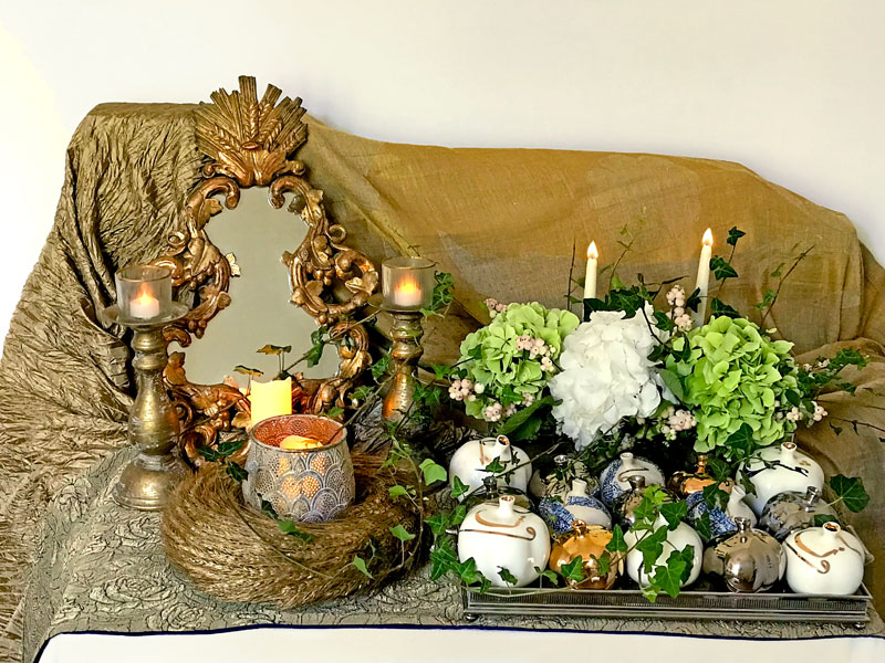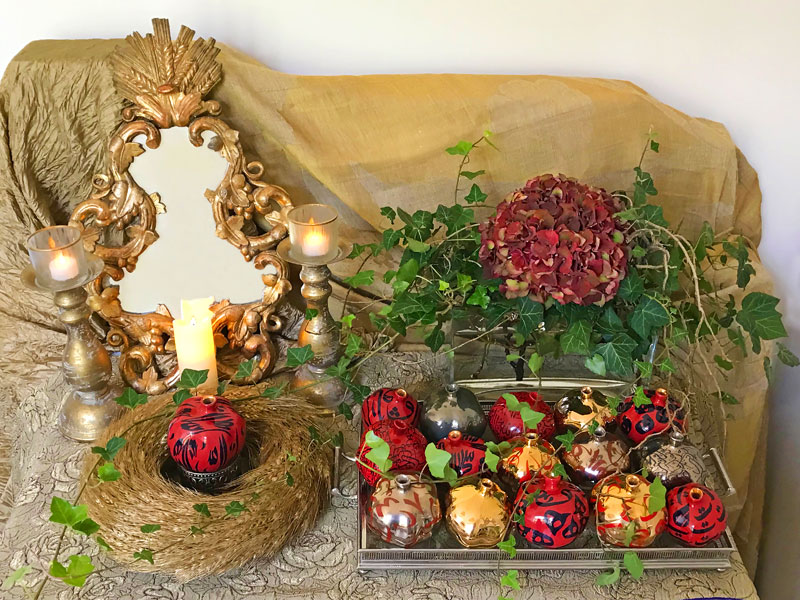 This month, two simple arrangements alluding to the Persian sofreh, with identical backdrops but contrasting colour schemes, are presented. Being the pomegranate (anar) season, they both celebrate the works of the Iranian/Canadian artist, Keyvan Fehri (www.keyvanfehri.com). Especially in the Persian tradition, sculptured pomegranates are popular symbolic decorative elements. However, very few boast such lifelike form and appearance as the works of Keyvan Fehri. Both sofrehs incorporate a mirror, candelabra and a wreath made of subtly gold-tined wheat sheaves. In September, different varieties and shades of hydrangeas are available, which have been included in these sofrehs, together with trailing ivies.