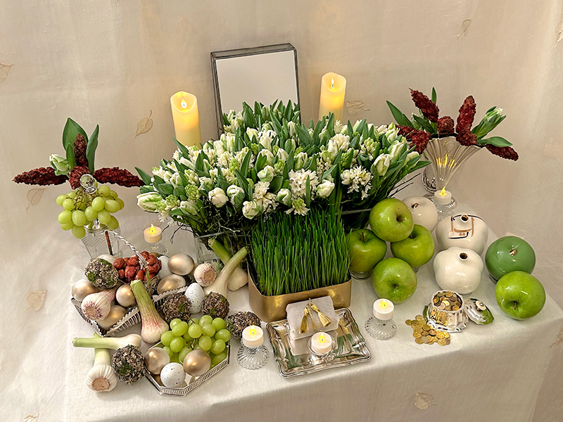 Due to the tragic and uncertain situation in Iran at present, most Nowruz gatherings and celebrations have been cancelled. During these incredibly challenging times, for all Iranians around the world, we limit ourselves to presenting a simple and serene sofreh in predominantly soft tones of white and green. The focus is on discussing the various revered symbolic elements of the sofreh-ye haft sinn, hoping for peace, harmony, good fortune and a new beginning.