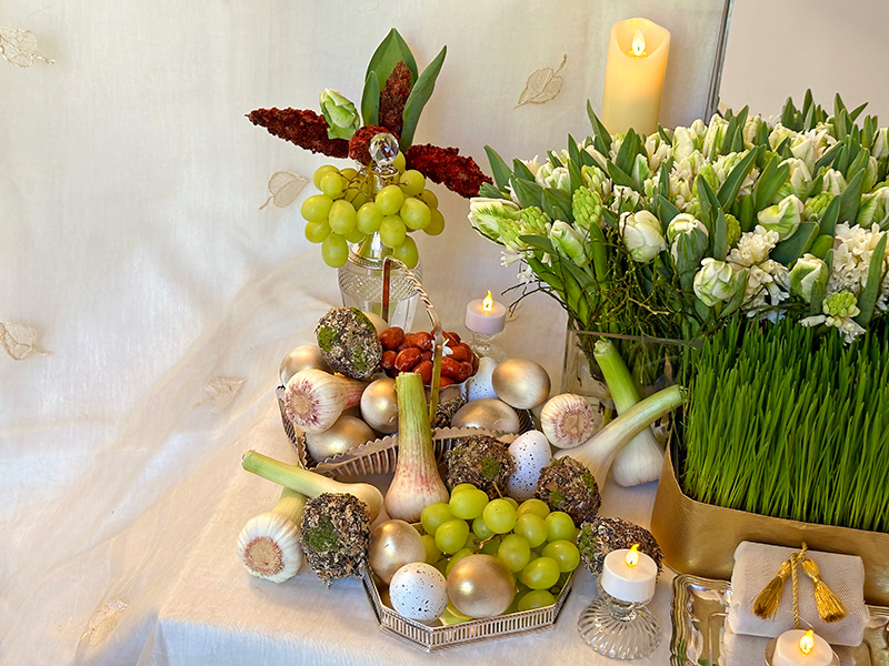 This is the left side of the sofreh-ye haft sinn. It incorporates a flask of vinegar (serkeh), cherished for its medicinal properties and a symbol of patience, embellished with gracefully hanging green grapes. A few clusters of sumac in the backdrop create a delicate balance with the right side of this sofreh. A container of senjed (jujube fruit, or Russian olive), representing love and rebirth, is surrounded by subtly decorated eggs, symbolizing life and fertility. Bulbs of fresh garlic (sir), which are believed to have medicinal and evil-averting powers, are on display.