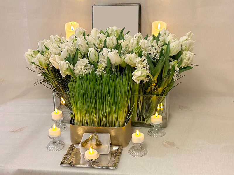 This is the overall view of the simple and serene sofreh-ye haft sinn designed to mark the Nowruz of 2026. With its harmonious tones it echoes the desired spirit of calm and peace, while comprising the essential symbolic elements of the sofreh-ye haft sinn. This fragrant sofreh showcases an impressive blend of white parrot tulips and hyacinths, heralding the arrival of spring and the Persian New Year (Nowruz). A block of germinated wheat (sabzeh), the essence of this spring festival (Nowruz) and a symbol of growth and rebirth, is on display. As usual the sofreh is softly illuminated by multiple flames.